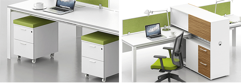 | 移动柜,可带软包方便沟通时使用,小家具,大用途 | 桌子搭配文件柜,更大的储物空间 |