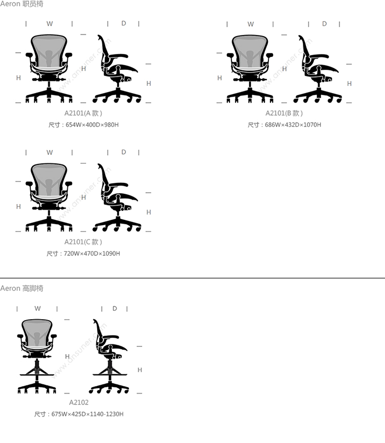 Aeron 职员椅 系列尺寸/示意图