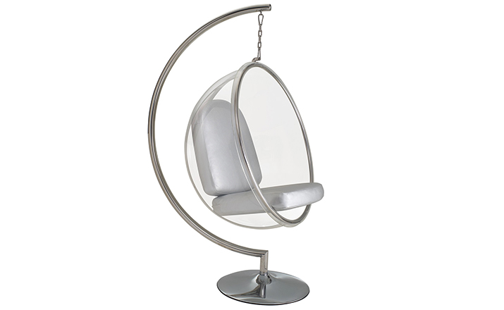 "芬兰家具设计大师艾洛.阿尼奥(Eero Aarnio)在德国品牌Adelta的代表作Bubble Chair(泡泡椅)。灵感来自于Ball Chair,但尺寸略小,而且椅子是以压克力制成,光线可以从四面八方透进。压克力加热充气,使它成为皂泡状,加入一个钢圈和椅垫即成。这样一组貌似轻巧的家具,但却能负重至少200公斤以上,由天花板垂链将Bubble吊起,宛如漂浮于空气中的泡泡一般!洁净面透明!带着科技感的椅子,又像置身于太空中,未来感十足。摆脱了椅子就是要放在地板上的刻板印象。最适合为摄影背景之用。坐在这把椅子上,即使身处一个拥挤的空间,也有点遗世独立的奇妙感觉。挪威一家电话公司在总公司入口大厅吊了几把这样的椅子,让客户可以在打行动电话时,有个宁静的空间。这件作品在1966年的科隆家具博览会上一举成名。