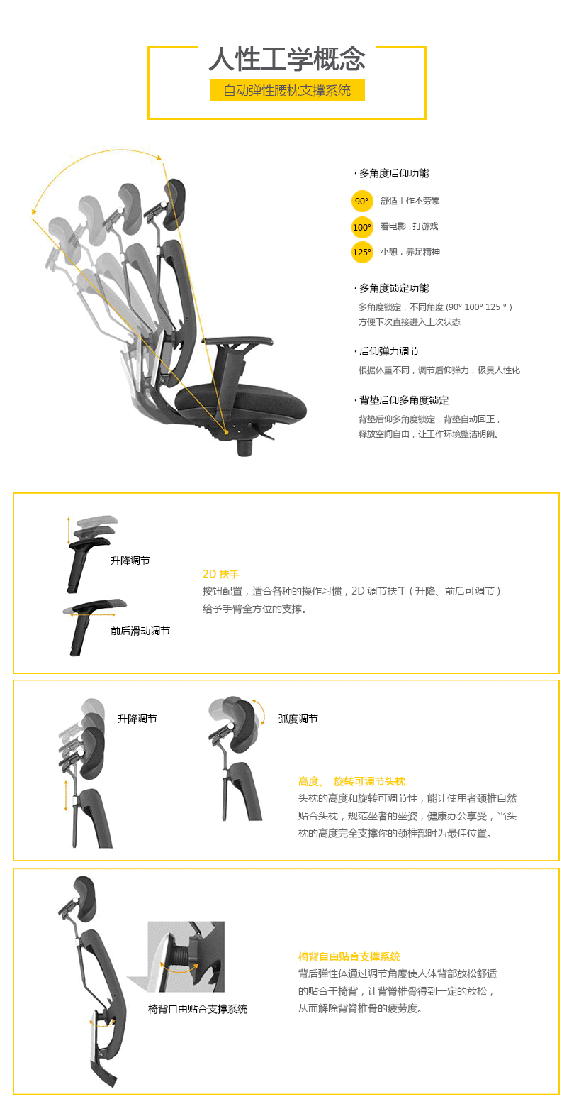 CG-E1055的优美设计有利于持久的舒适和美感。工学椅的结构和功能利用同步倾仰底盘控制功能锁定,滑座和高度调节。高度和角度均可调的扶手和头枕都包含在这张特有的工学椅里。