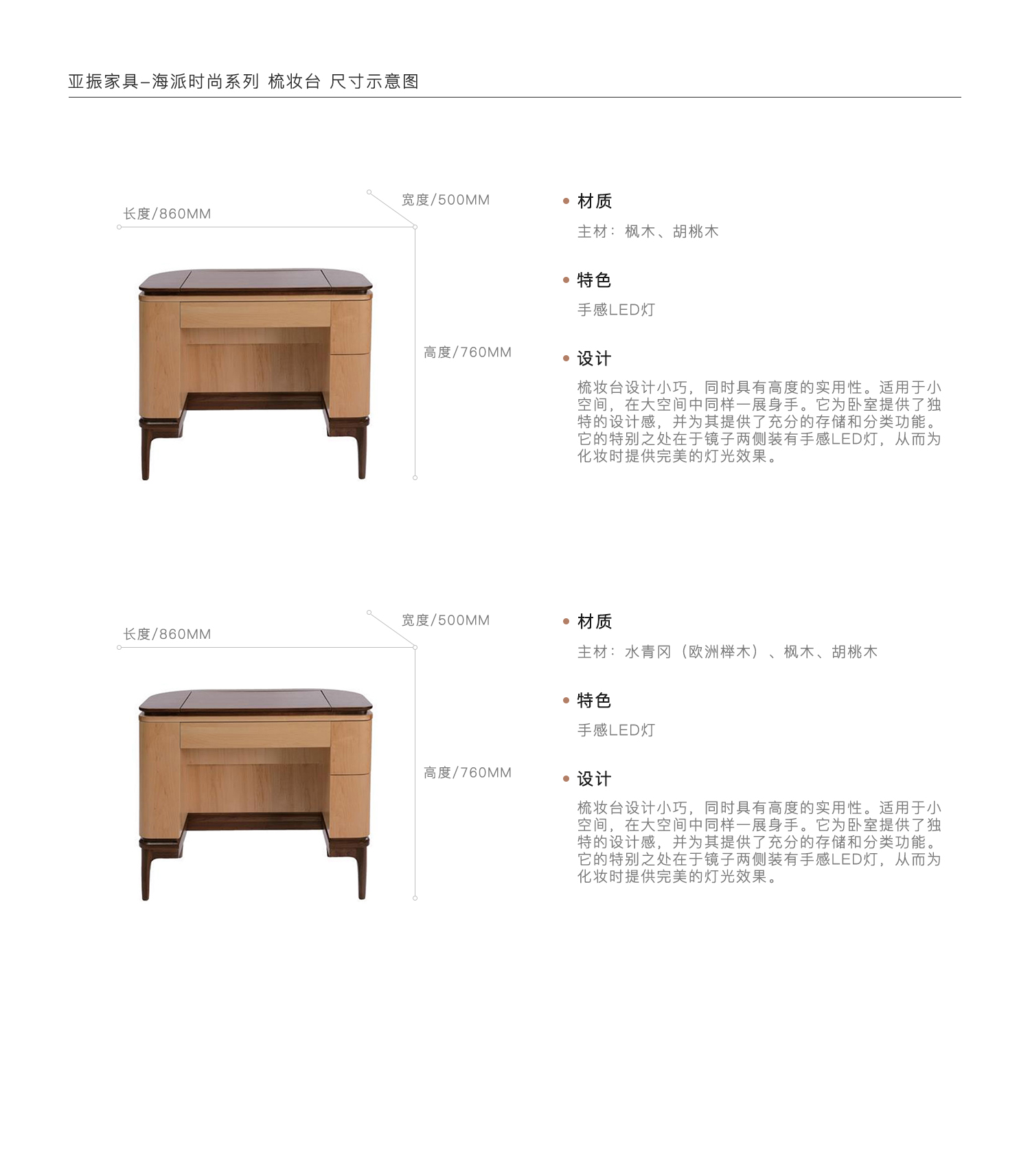 梳妆台设计小巧,同时具有高度的实用性。适用于小空间,在大空间中同样一展身手。它为卧室提供了独特的设计感,并为其提供了充分的存储和分类功能。它的特别之处在于镜子两侧装有手感LED灯,从而为化妆时提供完美的灯光效果。
