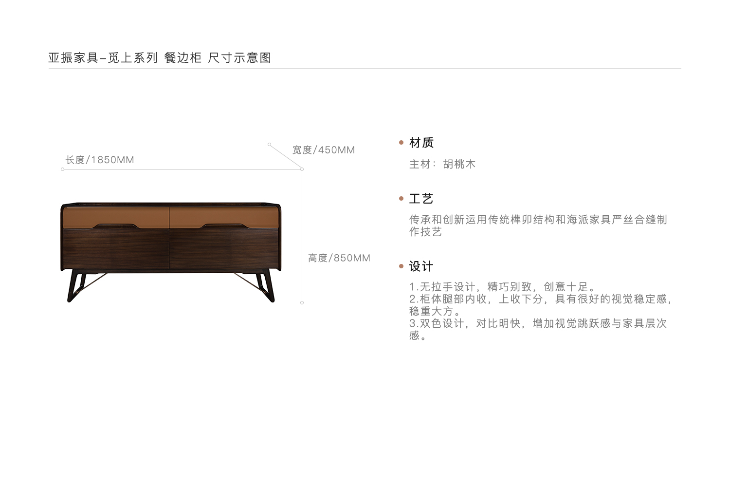 1.无拉手设计,精巧别致,创意十足。 2.柜体腿部内收,上收下分,具有很好的视觉稳定感,稳重大方。 3.双色设计,对比明快,增加视觉跳跃感与家具层次感。
