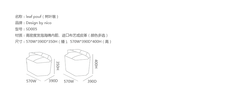 Leaf Pouf(树叶墩)是设计师Nicolette设计的作品。大多数的脚凳都只注重于形式和形状,很少能兼具椅子的功能。Leaf Pouf(树叶墩)不仅仅是一个脚凳,同时它也是一个极具吸引力的座凳,由经验丰富的工匠精心制作,精美别致,用料高级,采用高级Kvadrat羊毛(皮革)扪面。他们可以单独使用,作为一个独立的个体,在任何地方都是非常特别且令人印象深刻的,不会淹没在环境中。他们也可以多个组合,从而形成一个沙发床,还不失协调性和美感。无论用在任何地方,他们都可以满足您的创意,想法,发挥您的想象力自由组合。